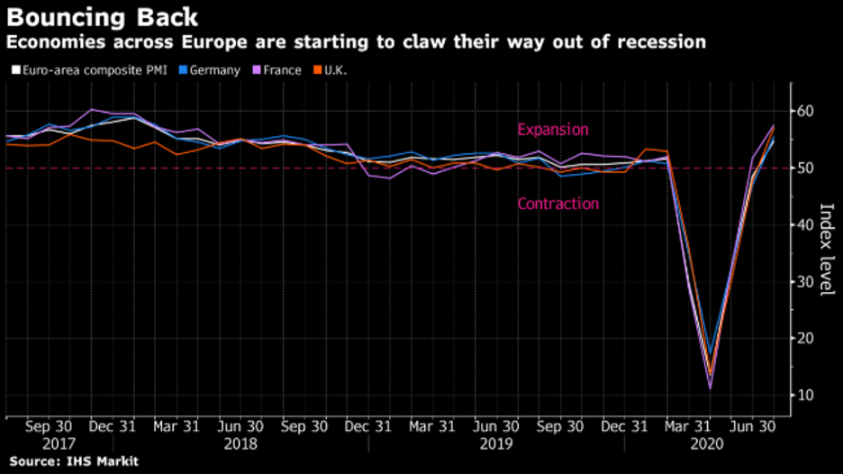 European private sector activity roared back to growth levels in June, as economies began unwinding restrictions put in place due to Covid-19. PMI numbers of the continent’s largest economies all returned levels above the expansionary level of 50.