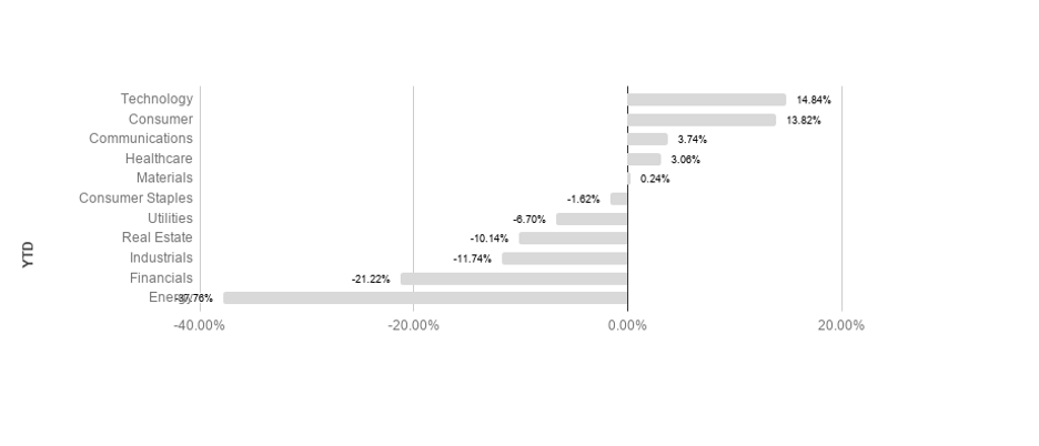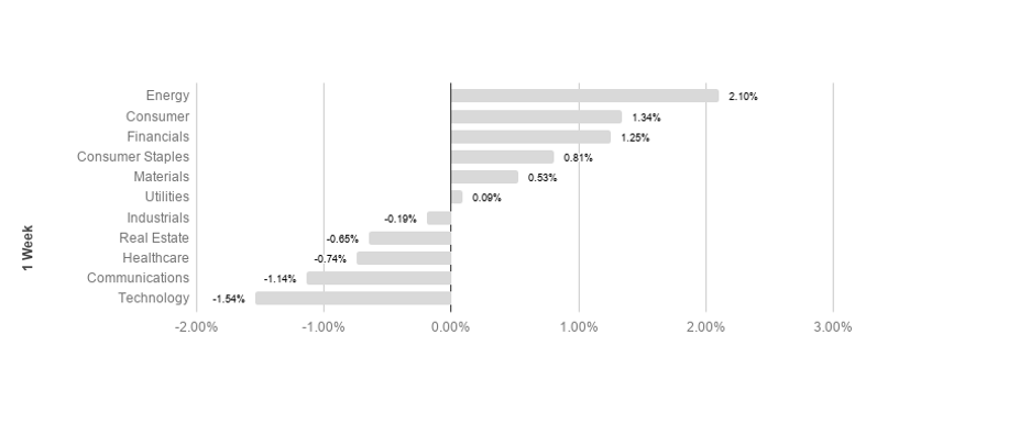 S&P sectors returned mixed results this week, as broad market movements showed investors favoring non defensive sectors. Energy led the best performing sectors, followed by consumer discretionary, returning 2.10% and 1.34% respectively. Communications and technology performed the worst, posting -1.14% and -1.54% respectively. Technology leads the pack so far YTD, returning 14.84% in 2020.