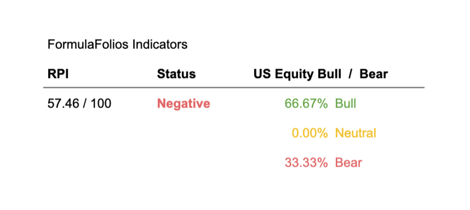 In a nutshell, we want the RPI to be low on the scale of 1 to 100. For the US Equity Bull/Bear indicator, we want it to read least 66.67% bullish. When those two things occur, our research shows market performance is strongest and least volatile.