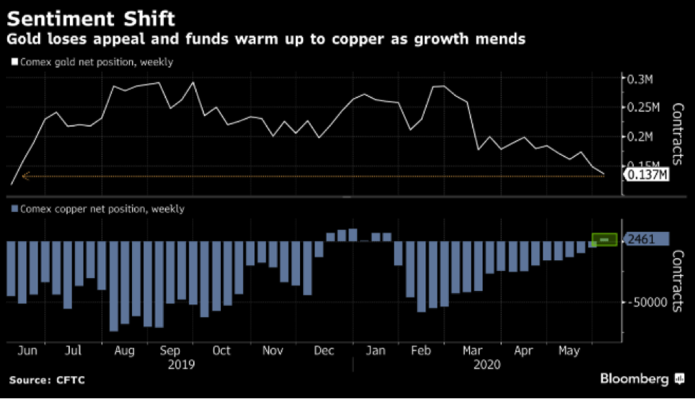 A notable shift took place last month in the commodity futures market. For the first time since January, copper futures have swung into a positive net position. Copper is considered an industrial commodity, usually rising as economic activity increases. An improvement in outlook for the metal could be a sign investors expect economic health to improve.
