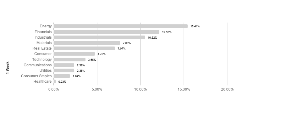 S&P sectors returned unanimously positive results this week for the second week in a row, as broad market movements showed investors buying into all sectors. Energy led the best performing sectors, followed by financials, returning 15.41% and 12.16% respectively. Consumer staples and healthcare performed the worst, posting 1.89% and 0.23% respectively. Technology leads the pack so far YTD, returning 10.55% in 2020.