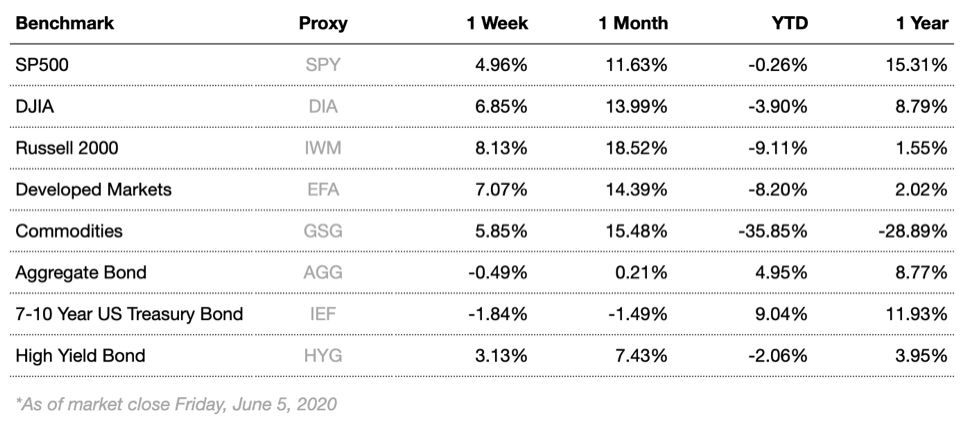 Markets rose dramatically this week as May employment data shocked analysts. Context needs to be given to fully appreciate how surprising Friday’s numbers were; no one anticipated the employment numbers released on Friday. And by no one, that means literally no one. Bloomberg survey analysis shows that not a single economist predicted a positive number, much less an incredible hiring surge. New hires for 2.5 million people were reported. Not only is this the highest number in U.S. history, it also exceeded consensus expectations by an unprecedentedly wide gap of 10 million people, making May’s hiring numbers record setting in two ways. Risks are obviously still prevalent, the economy is certainly not out of the woods yet. Tensions with China continue to be an unknown and will likely remain in focus. Unemployment is likely to remain elevated for several more weeks, and the unemployment rate remains at the second highest level in history.