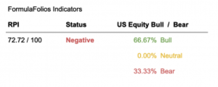 In a nutshell, we want the RPI to be low on the scale of 1 to 100. For the US Equity Bull/Bear indicator, we want it to read least 66.67% bullish. When those two things occur, our research shows market performance is strongest and least volatile.